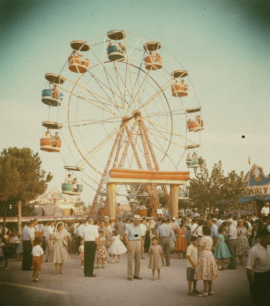 La noria no es solo una atracción, es el corazón y el emblema de cualquier feria que se precie. Su imponente estructura se alza sobre el horizonte, un faro de luces y color que atrae las miradas de pequeños y mayores.